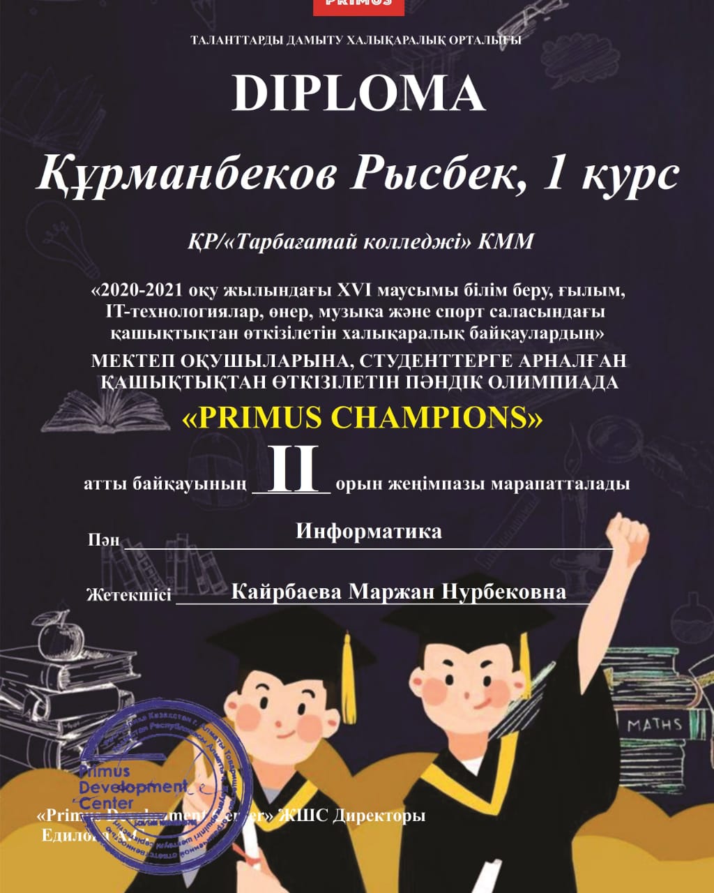 "PRIMUS CHAMPIONS" атты байқауының II орын иегері, I курс студенті Құрманбеков Рысбек марапатталды