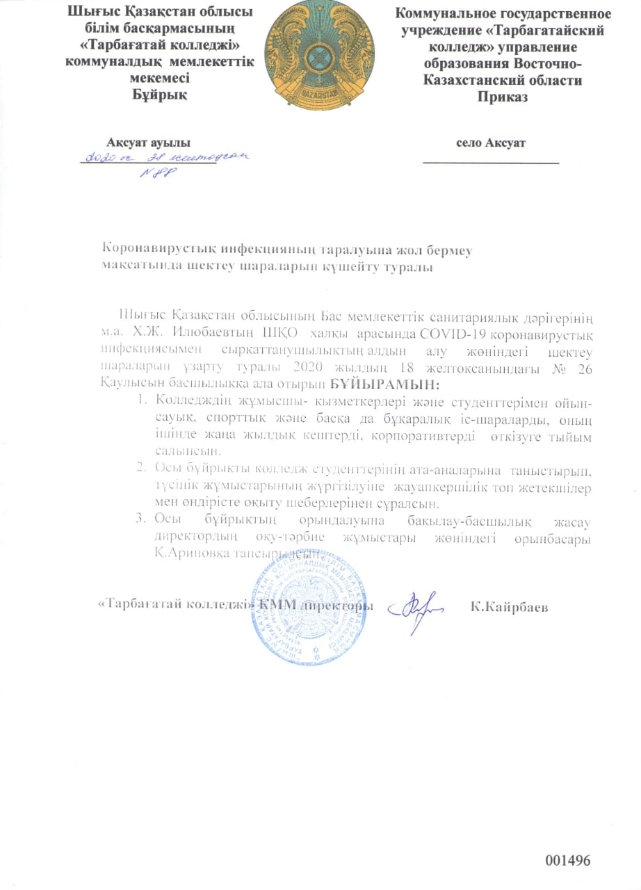 Коронавирустық инфекцияның таралуына жол бермеу мақсатында шектеу шараларын күшейту туралы бұйрық